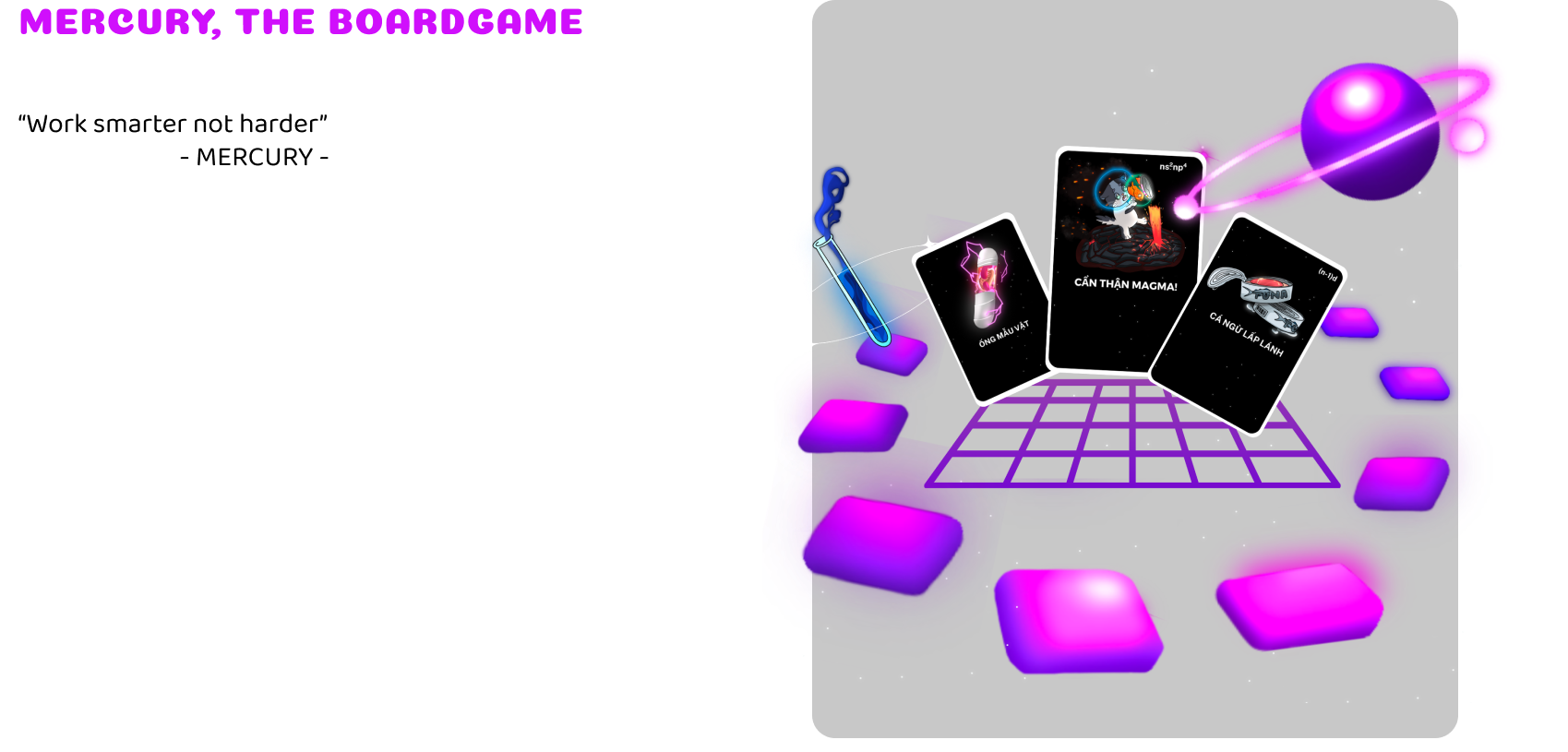 Các nghiên cứu đã chỉ ra rằng, để nâng cao khả năng sáng tạo và tư duy, không nên tiếp thu các kiến thức một cách máy móc, rập khuôn. Thay vào đó, MERCURY tạo môi trường vui chơi lành mạnh bằng các mô hình vừa học vừa chơi MERCURY – THE BOARD GAME để tạo sự hứng thú, kích thích suy nghĩ, tư duy,… từ đó giúp tiếp thu kiến thức tốt hơn.